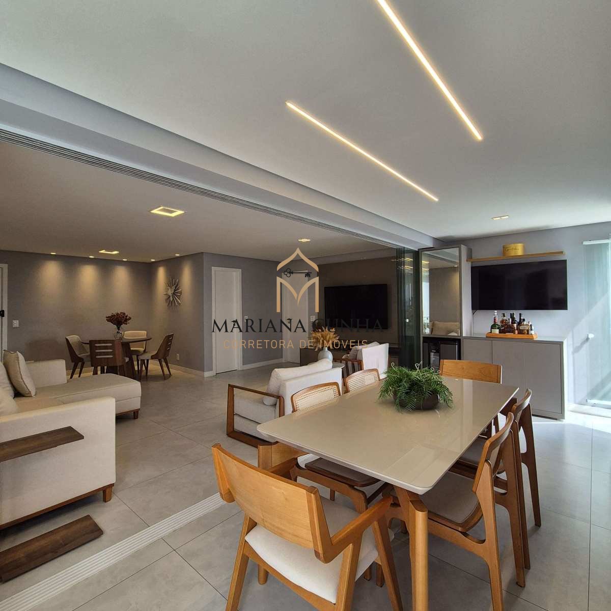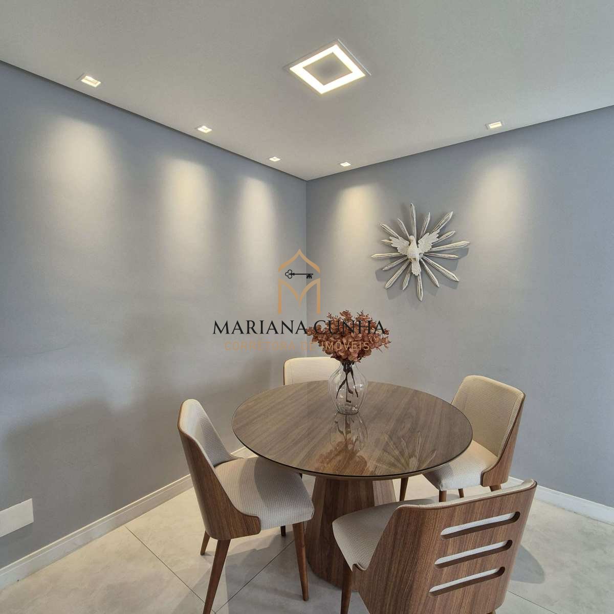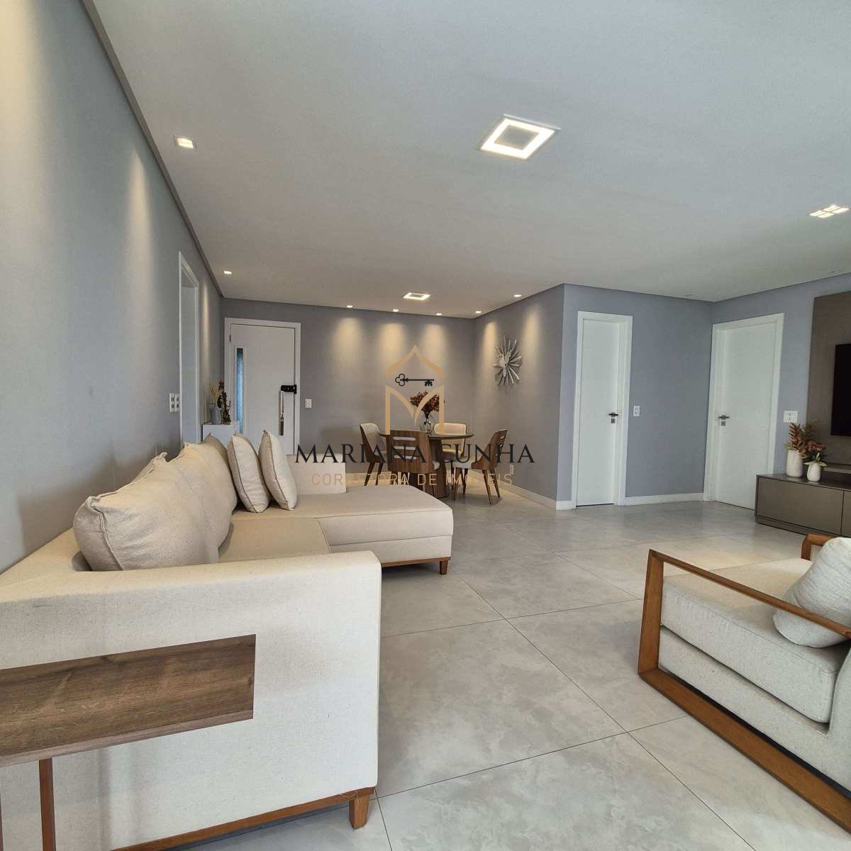 Apartamento clássico e elegante com piso porcelanato, com gesso e iluminação planejada.